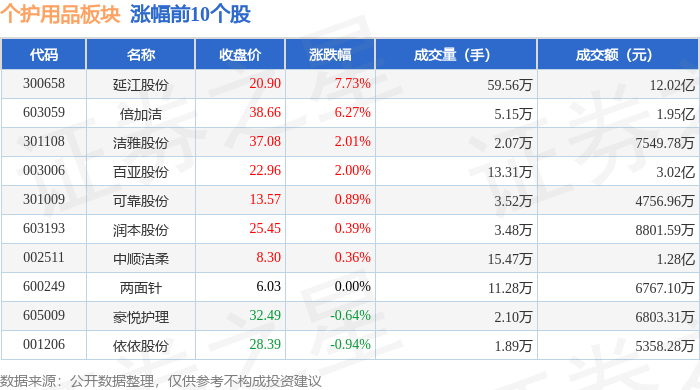 | 代码 | 名称 | 收盘价 | 涨跌幅 | 成交量(手) | 成交额(元) | | --- | --- | --- | --- | --- | --- | | 301108 | 洁雅股份 | 35.51 | -1.25% | 1.80万 | 6537.74万 | | 002511 | 中顺洁桑 | 8.33 | -0.24% | 25.92万 | 2.15 Z | | 001328 | 登康口腔 | 40.85 | -0.10% | 2.00万 | 8033.28万 | | 300888 | 稳健医疗 | 36.55 | 0.55% | S 6.16万 | 2.25亿 | | 6005009 | 家倪护理 | 32.33 | 0.72% | 1.46万 | 4726.60万 | | 001206 | 依依股份 | 28.27 | 0.75% | 1.84万 | 5203.91万 | | 603193 | 润本股份 | 24.93 | 0.81% | 2.04万 | 5094.38万 | | 603059 | 倍加洁 | 35.49 | 0.91% | 2.95万 | 1.05亿 | | 600249 | ...