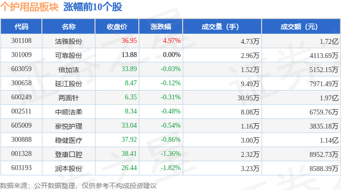 | 代码 | 名称 | 收盘价 | 涨跌幅 | 成交量(手) | 成交额(元) | | --- | --- | --- | --- | --- | --- | | 001328 | 登康口腔 | 39.56 | -3.21% | 2.59万 | 1.04亿 | | 003006 | 自亚股份 | 22.57 | -2.12% | 5.35万 | 1.22亿 | | 002511 | 中顺洁桑 | 8.30 | -1.19% | 7.92万 | 6596.23万 | | 300888 | 稳健医疗 | 38.54 | -0.59% | + 4.12万 | 1.60亿 | | 300658 | 延江股份 | 8.16 | -0.24% | 11.79万 | 9691.52万 | | 605009 | 豪悦护理 | 33.23 | 0.15% | 1.18万 | 3918.63万 | | 603059 | 倍加洁 | 34.19 | 0.26% | 2.90万 | 9910.83万 | | 301009 | 可靠股份 | 13.89 | 2.21% | 3.42万 | 4709.91万 | | 600249 | 两 ...