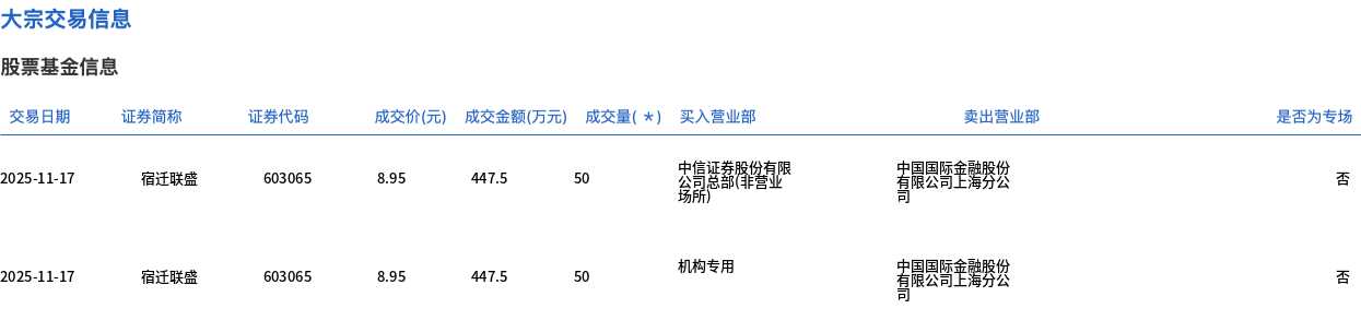 11月17日,宿迁联盛大宗交易成交100万股,成交额895万元,占当日总成交额的16.13%,成交价8.95元,较市场收盘价9.04元折价1%。 | 交易日期 | 证券简称 | 证券代码 | 成交价(元) | 成交金额(万元) 成交量( * ) 买入营业部 | | | | 卖出营业部 | | --- | --- | --- | --- | --- | --- | --- | --- | --- | | 2025-11-17 | 宿迁联盛 | 603062 | 8.95 | 447.5 | 50 | 中信证券股份有限 公司总部(菲雪业 场所) | 中国国际金融股公 ם | | | 2025-11-17 | 宿迁联盛 | 603062 | 8.95 | 447.5 20 | | 机构专用 | 中国国际金融股份 有限公司上海分公 | | ...