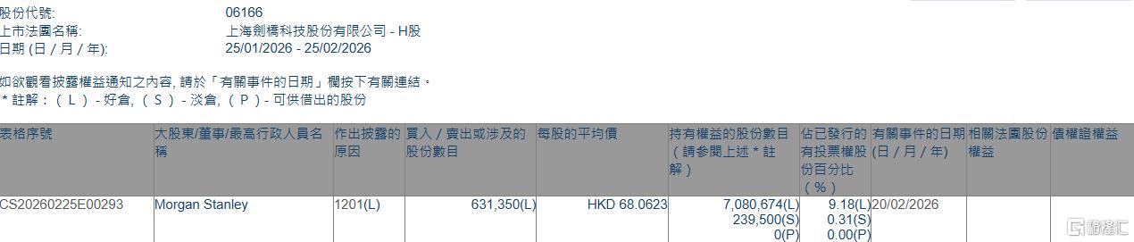 格隆汇2月25日丨根据联交所最新权益披露资料显示,2026年2月20日,剑桥科技(06166.HK)遭Morgan Stanley在场内以每股均价68.0623港元减持好仓63.14万 股,涉资约4297.11万港元。 减持后,Morgan Stanley最新持好仓数目为708.07万股,持好仓比例由10.00%下降至9.18%。 | 股份代號: | 06166 | | --- | --- | | 上市法國名稱: | 上海劍橋科技股份有限公司 - H股 | | 日期 (日 / 月 / 年): | 25/01/2026 - 25/02/2026 | | 表格序號 | 大股東/董事/最高行政人員名 作出披露的 買入 / 賣出或涉及的 每股的平均價 | | | | | 持有權益的股份數目 佔已發行的 有關事件的日期 相 | | --- | --- | --- | --- | --- | --- | --- | | | 篇 | 局本 | 股份數目 | | | (請參閱上述*註 有投票權股(日/月/年) 福 | | | | | | | | 185 份自分比 | | September 2000 Comments of ...