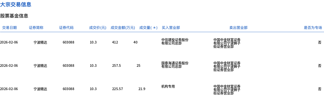 | 交易日期 | 证券简称 | 证券代码 | | | 成交价(元) 成交金额(万元) 成交量(*) 买入营业部 | | | 卖出营业部 | | --- | --- | --- | --- | --- | --- | --- | --- | --- | | 2026-02-06 | 宁波精达 | 603088 | 10.3 | 412 | 40 | 中信建投证券股份 有限公司总部 | 中国中金财富班券 有限公司宁波狮子 | | | 2026-02-06 | 宁波精达 | 603088 | 10.3 | 257.5 | રેત | 国泰海通证券股份 有限公司总部 | 中国中金财富研学 | | | 2026-02-06 | 宁波精达 | 603088 | 10.3 | 225.57 | 21.9 | 机构专用 | 中国中金财富班券 有限公司宁波狮子 | | 2月6日,宁波精达大宗交易成交86.9万股,成交额895.07万元,占当日总成交额的6.68%,成交价10.3元,较市场收盘价11.44元折价9.97%。 ...