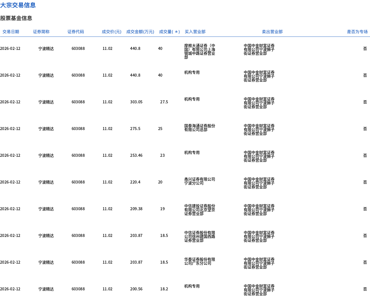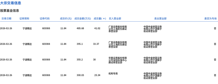 2月26日,宁波精达大宗交易成交129.73万股,成交额1536.01万元,占当日总成交额的2.55%,成交价 11.84元,较市场收盘价13.63元折价13.13%。 | 交易日期 | 证券調称 | 证券代码 | | | 成交价(元) 成交金额(万元) 成交量(*) 买入营业部 | | 类出管业部 | 是否为专场 | | --- | --- | --- | --- | --- | --- | --- | --- | --- | | 2026-02-26 | 宁波精达 | 603088 | 11.84 | 485.68 | 41.02 | 公司上海民生盛宴 | Haranta Ma | 彩 | | 2026-02-26 | 宁波精达 | 603088 | 11.84 | 395.1 | 33.37 | 公司日报 发生路营 | 新科学 | 중 | | 2026-02-26 | 宁波精达 | 603088 | 11.84 | 355.2 | 30 | 公司是新启海中心 | 在国家都有限公司 | 18 | | 2026-02-26 | 宁波精达 | 603088 | 11.84 | 300.03 | 25.34 | ...