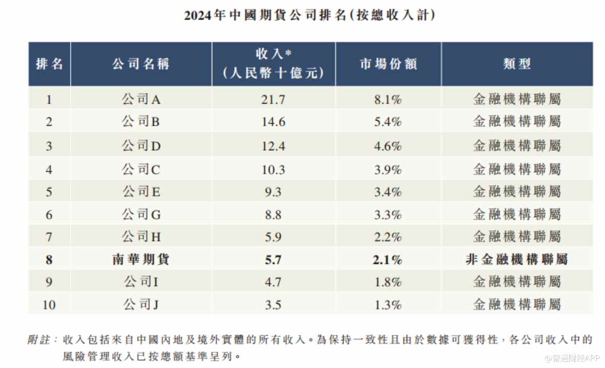 年末港交所打新市场迎来收官冲刺。 招股书显示,南华期货成立于1996年,是中国期货行业首批成立的公司之一。2019年8月登陆上交所成为国内首家A股上市期货公司。此次港股上市,南华 期货将成为继弘业期货之后第二家实现"A+H"双上市的期货公司。 据弗若斯特沙利文报告,按2024年总收入计,公司在国内所有期货公司中排名第八,在非金融机构相关期货公司中排名第一。 | 排名 | 公司名稱 | 收入* | 市場份額 | 類型 | | --- | --- | --- | --- | --- | | | | (人民幣十億元) | | | | I | 公司A | 21.7 | 8.1% | 金融機構聯屬 | | 2 | 公司B | 14.6 | 5.4% | 金融機構聯屬 | | 3 | 公司D | 12.4 | 4.6% | 金融機構聯屬 | | ব | 公司C | 10.3 | 3.9% | 金融機構聯屬 | | ર | 公司E | 9.3 | 3.4% | 金融機構聯屬 | | 6 | 公司G | 8.8 | 3.3% | 金融機構聯屬 | | 7 | 公司H | 5.9 | 2.2% | 金融機構聯屬 | | 8 | ...