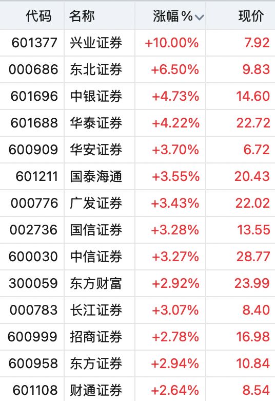 | 代码 | 名称 | 涨幅%v | 现价 | | --- | --- | --- | --- | | 002961 | 瑞达期货 | +10.00% | 29.38 | | 001236 | 引不解采 | +8.44% | 11.31 | | 600927 | 永安期货 | +4.37% | 15.54 | | 603093 | 南华期货 | +3.27% | 20.22 | | 300773 | 拉卡拉 | +3.22% | 22.43 | | 000617 | 中油资本 | +2.74% | 9.37 | 编辑 | 钉钉 | 代码 | 名称 | 涨幅%√ | 现价 | | --- | --- | --- | --- | | 601377 | 兴业证券 | +10.00% | 7.92 | | 000686 | 东北证券 | +6.50% | 9.83 | | 601696 | 中银证券 | +4.73% | 14.60 | | 601688 | 华泰证券 | +4.22% | 22.72 | | 600909 | 华安证券 | +3.70% | 6.72 | | 601211 | 国泰海通 | +3.5 ...