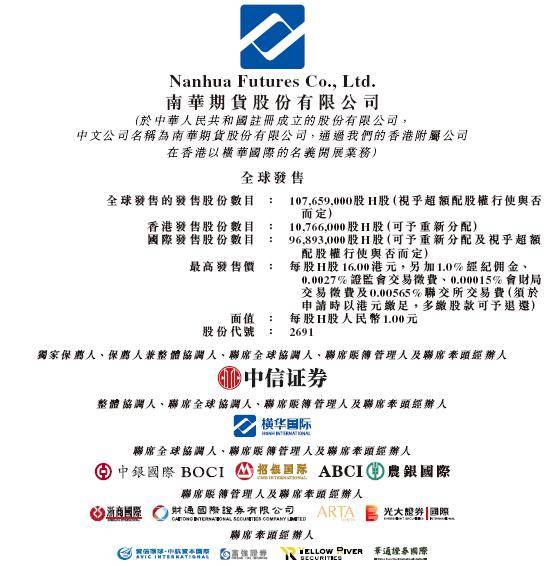 獨家保 贈人、保磨人兼整體協調人,聯席全球協調人、聯席製傳管理人及聯席奉頭組織人 ●中信证券 Nanhua Futures Co., Ltd. 南華期貨股份有限公司 (於中華人民共和國註冊成立的股份有限公司。 中文公司名稱為南華期貨股份有限公司,通過我們的香港附屬公司 在香港以横華國際的名義問展業務) 全球發售 | 全球發售的發售股份數目 : | 107.659.000股H股(視乎超额配股權行使與否 | | --- | --- | | | 圓足) | | 香港發售股份數目 : | 10.766.000股H股(可予重新分配) | | 國際發售股份數目 : | 96,893,000 股H股(可于重新分配及視乎超額 | | | 配股權行使與否而定) | | 最高發售價 : | 每股H股16.00港元,另加1.0%經紀佣金、 | | | 0.0027% 證監會交易做費、0.00015% 會财局 | | | 交易微量及0.00565%聯交所交易費(須於 | | | 申請時以港元藏足,多繳股款可于提爐) | | 图 | 每股H股人民幣1.00元 | | 股份代號 : | 2691 | 整體 培調人、聯席全球協劇人、聯席獲 ...