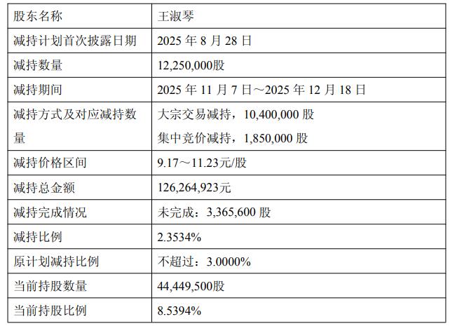 恒银科技公告显示,2025年11月7日至2025年12月18日,王淑琴减持数量12,250,000股,减持价格区间 9.17元/股至11.23元/股,减持总金额126,264,923元。 | 股东名称 | 王淑琴 | | --- | --- | | 减持计划首次披露日期 | 2025年8月28日 | | 减持数量 | 12,250,000股 | | 减持期间 | 2025年11月7日~2025年12月18日 | | 减持方式及对应减持数 | 大宗交易减持,10.400.000 股 | | 를 | 集中竞价减持,1.850,000 股 | | 减持价格区间 | 9.17~11.23元/股 | | 减持总金额 | 126,264,923元 | | 减持完成情况 | 未完成:3,365,600 股 | | 减持比例 | 2.3534% | | 原计划减持比例 | 不超过:3.0000% | | 当前持股数量 | 44.449.500股 | | 当前持股比例 | 8.5394% | 本次减持计划实施前,恒银科技持股5%以上非第一大股东王淑琴持有公司股份56,699,500股,占公司总 股本的10.8929%。前述股份 ...