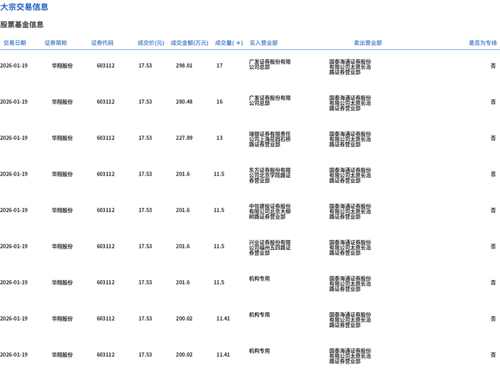 | 交易日期 | 证券简称 | 证券代码 | 成交价(元) | | 成交金额(万元) 成交量(*) 买入营业部 | | 类出营业部 | 是否为专场 | | --- | --- | --- | --- | --- | --- | --- | --- | --- | | 2026-01-19 | 华用龄份 | 603112 | 17.53 | 298.01 | 17 | A MIL ST RECORD FOR THE POST | | 香 | | 2026-01-19 | 华翔股份 | 603112 | 17.53 | 280.48 | 16 | 公司总数据有限 | | 줄 | | 2026-01-19 | 华加盟份 | 603112 | 17.53 | 227.89 | 13 | | | る | | 2026-01-19 | 华用股份 | 603112 | 17.53 | 201.6 | 11.5 | | | る | | 2026-01-19 | 华翔股份 | 603112 | 17.53 | 201.6 | 11.5 | | | 종 | | 2026-01-19 | 华用龄份 | 603112 | 17.53 ...