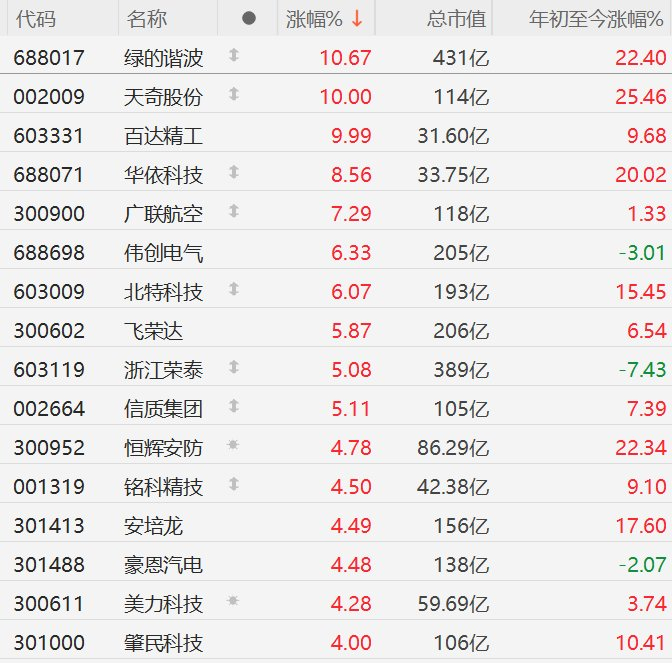 格隆汇1月30日|A股市场人形机器人概念股走强,绿的谐波、天奇股份、百达精工涨停,华依科技涨 超8%,广联航空涨超7%,伟创电气、北特科技涨超6%,飞荣达、浙江荣泰、信质集团涨超5%。 消息面上,1月29日,北京人形机器人创新中心的中试验证平台正式启动,是北京首个人形机器人中试 平台。平台已具备试制生产和测试设备500台套,以及具身智能机器人年产能5000台套的能力。 | 代码 | 名称 | | 涨幅% ↓ | 总市值 | 年初至今涨幅% | | --- | --- | --- | --- | --- | --- | | 688017 | 绿的谐波 | 1 | 10.67 | 431亿 | 22.40 | | 002009 | 天詞股份 | 1 | 10.00 | 114乙 | 25.46 | | 603331 | 百达精工 | | 9.99 | 31.60亿 | 9.68 | | 688071 | 华依科技 | 1 | 8.56 | 33.75亿 | 20.02 | | 300900 | 广联航空 | 1 | 7.29 | 118亿 | 1.33 | | 688698 | 伟创电气 | | 6.33 | 2 ...