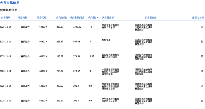 春风动力今日大宗交易折价成交14.05万股,成交额3142.56万元