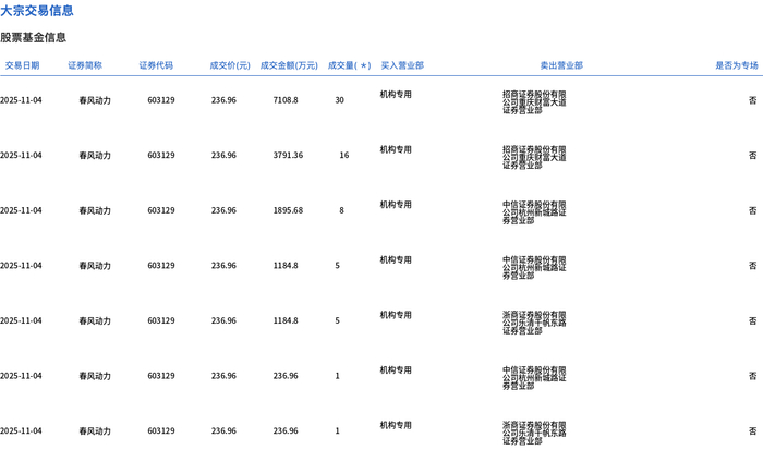 Core Insights - Chuncheng Power conducted 7 block trades on November 4, totaling 660,000 shares and a transaction amount of 156 million yuan, with a transaction price of 236.96 yuan, reflecting a discount of 5.13% compared to the closing price of the day [2][3] - The closing price of Chuncheng Power on the same day was 249.78 yuan, down 1.97%, with a turnover rate of 0.68% and a total transaction amount of 263 million yuan, indicating a net outflow of 13.75 million yuan in main funds [2][3] Trading Details - The block trades included: - 30,000 shares for 71.09 million yuan at 236.96 yuan, with a discount of 5.13%, executed by institutional special seats [3] - 16,000 shares for 37.91 million yuan at the same price and discount, also by institutional special seats [3] - Additional trades included 8,000 shares, 5,000 shares, and smaller transactions, all at the same price and discount, indicating strong institutional participation [3] Financing Data - The latest financing balance for Chuncheng Power is 15.7 million yuan, showing a decrease of 8.87 million yuan over the past five days, representing a decline of 5.33% [3] - The company was established on December 9, 2003, with a registered capital of 1.52577663 billion yuan [3]