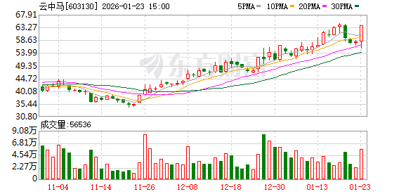 声明:市场有风险,投资需谨慎。本文为AI大模型基于第三方数据库自动发布,任何在本文出现的信 息(包括但不限于个股、评论、预测、图表、指标、理论、任何形式的表述等)均只作为参考,不构成 个人投资建议。受限于第三方数据库质量等问题,我们无法对数据的真实性及完整性进行分辨或核验, 因此本文内容可能出现不准确、不完整、误导性的内容或信息,具体以公司公告为准。如有疑问,请联 系biz@staff.sina.com.cn。 责任编辑:小浪快报 登录新浪财经APP 搜索【信披】查看更多考评等级 2026年1月23日,云中马(sh603130)触及涨停,涨停价63.93元,涨幅10%,总市值87.91亿元,流通市 值87.91亿元,截止发稿,总成交额2.58亿元。 根据喜娜AI异动分析,云中马涨停原因可能如下,公司治理优化+营收增长+现金流改善: 1、公司正处 于治理结构转型期,治理规范化持续推进。近期修订22项制度,取消监事会,设立四大专业委员会,治 理结构向现代化转型;新一届董事会高票当选,管理层稳定性较强;还制定完善的信息披露、投资者关 系管理等制度,提高透明度。这些举措增强了市场对公司未来发展的信心。 2、公司经营方 ...