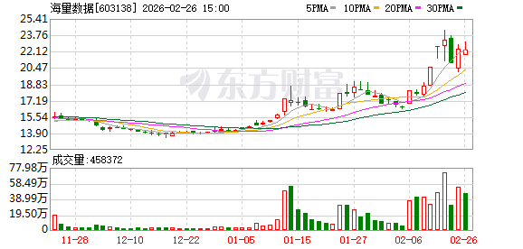 南财智讯2月12日电,海量数据公告,公司股票于2026年2月10日、2026年2月11日、2026年2月12日连续 三个交易日内收盘价格涨幅偏离值累计超过20%,根据《上海证券交易所交易规则》的有关规定,属于 股票交易异常波动情形。经公司自查,并向控股股东及实际控制人书面函证核实,截至本公告披露日, 公司、控股股东及实际控制人不存在应披露而未披露的重大事项,包括但不限于重大资产重组、股份发 行、重大交易、业务重组、股份回购、股权激励、破产重整、重大业务合作、引进战略投资者等;公司 生产经营活动正常,市场环境及行业政策未发生重大调整;未发现需要澄清或回应的媒体报道、市场传 闻或热点概念;公司董事、高级管理人员、控股股东、实际控制人及其一致行动人在本次异常波动期间 不存在买卖公司股票的情形,亦未发生业绩信息泄露。公司预计2025年度实现归属于上市公司股东的净 利润为-6,000万元至-4,000万元,扣除非经常性损益后的净利润为-6,800万元至-4,800万元;截至2026年2 月12日,公司滚动市盈率为负,市净率为8.67,高于所属行业"软件和信息技术服务业"平均市净率 5.81。 ...