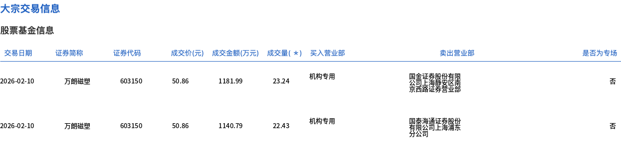 2月10日,万朗磁塑大宗交易成交45.67万股,成交额2322.78万元,占当日总成交额的7.29%,成交价50.86元,较市场收盘价57.8元折价12.01%。 | 交易日期 | 证券简称 | 证券代码 | 成交价(元) | 成交金额(万元) | 成交量(*) 买入营业部 | | | 卖出营业部 | | --- | --- | --- | --- | --- | --- | --- | --- | --- | | 2026-02-10 | 万朗磁塑 | 603150 | 50.86 | 1181.99 | 23.24 | 机构专用 | 公司上海静安区南 | | | 2026-02-10 | 万朗磁塑 | 603150 | 50.86 | 1140.79 | 22.43 | 机构专用 | 国泰海通证券股份 有限公司上海浦东 分公司 | | ...