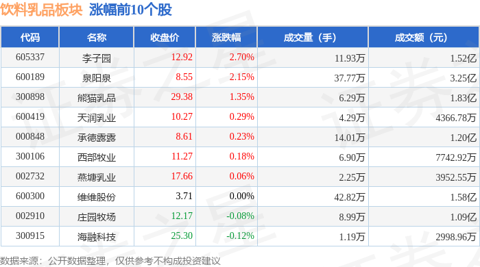 证券之星消息,1月26日饮料乳品板块较上一交易日下跌1.03%,养元饮品领跌。当日上证指数报收于 4132.61,下跌0.09%。深证成指报收于14316.64,下跌0.85%。饮料乳品板块个股涨跌见下表: | 代码 | 名称 | 收盘价 | 涨跌幅 | 成交量(手) | 成交额(元) | | --- | --- | --- | --- | --- | --- | | 605337 | 李子园 | 12.92 | 2.70% | 11.93万 | 1.52亿 | | 681009 | 泉阳泉 | 8.55 | 2.15% | 37.77万 | 3.25亿 | | 300898 | 熊猫乳品 | 29.38 | 1.35% | 6.29万 | 1.83亿 | | 600419 | 天润乳业 | 10.27 | 0.29% | 4.29万 | 4366.78万 | | 000848 | 承德國露 | 8.61 | 0.23% | 14.01万 | 1.20亿 | | 300106 | 西部牧业 | 11.27 | 0.18% | 6.90万 | 7742.92万 | | 002732 | 范捷乳业 | 17.66 ...