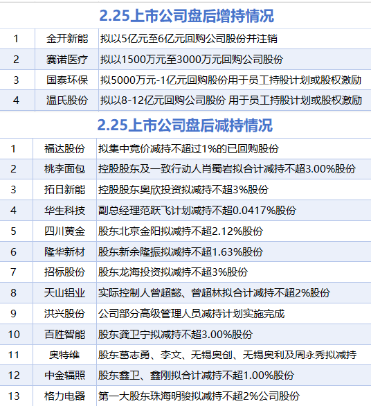 据统计,2月25日,盘后金开新能、赛诺医疗、国泰环保、温氏股份披露增持情况。包括福达股份、桃 李面包、拓日新能、华生科技、四川黄金、隆华新材、招标股份、天山铝业、洪兴股份、百胜智能、奥 特维、中金辐照、格力电器在内的13家A股上市公司披露减持情况。 | 1 | 金开新能 拟以5亿元至6亿元回购公司股份并注销 | | --- | --- | | 2 | 赛诺医疗 拟以1500万元至3000万元回购公司股份 | | ന | 国泰环保 拟5000万元-1亿元回购股份用于员工持股计划或股权激励 | | 4 | 温氏股份 拟以8-12亿元回购公司股份 用于员工持股计划或股权激励 | | 1 | 福达股份 | 拟集中竞价减持不超过1%的已回购股份 | | --- | --- | --- | | 2 | 桃李面包 | 控股股东及一致行动人肖蜀岩拟合计减持不超3.00%股份 | | 3 | 拓日新能 | 控股股东奥欣投资拟减持不超3%股份 | | 4 | 华生科技 | 副总经理范跃飞计划减持不超0.0417%股份 | | 5 | 四川黄金 | 股东北京金阳拟减持不超2.12%股份 | | 6 | 隆华新材 | 股东新余隆振拟 ...