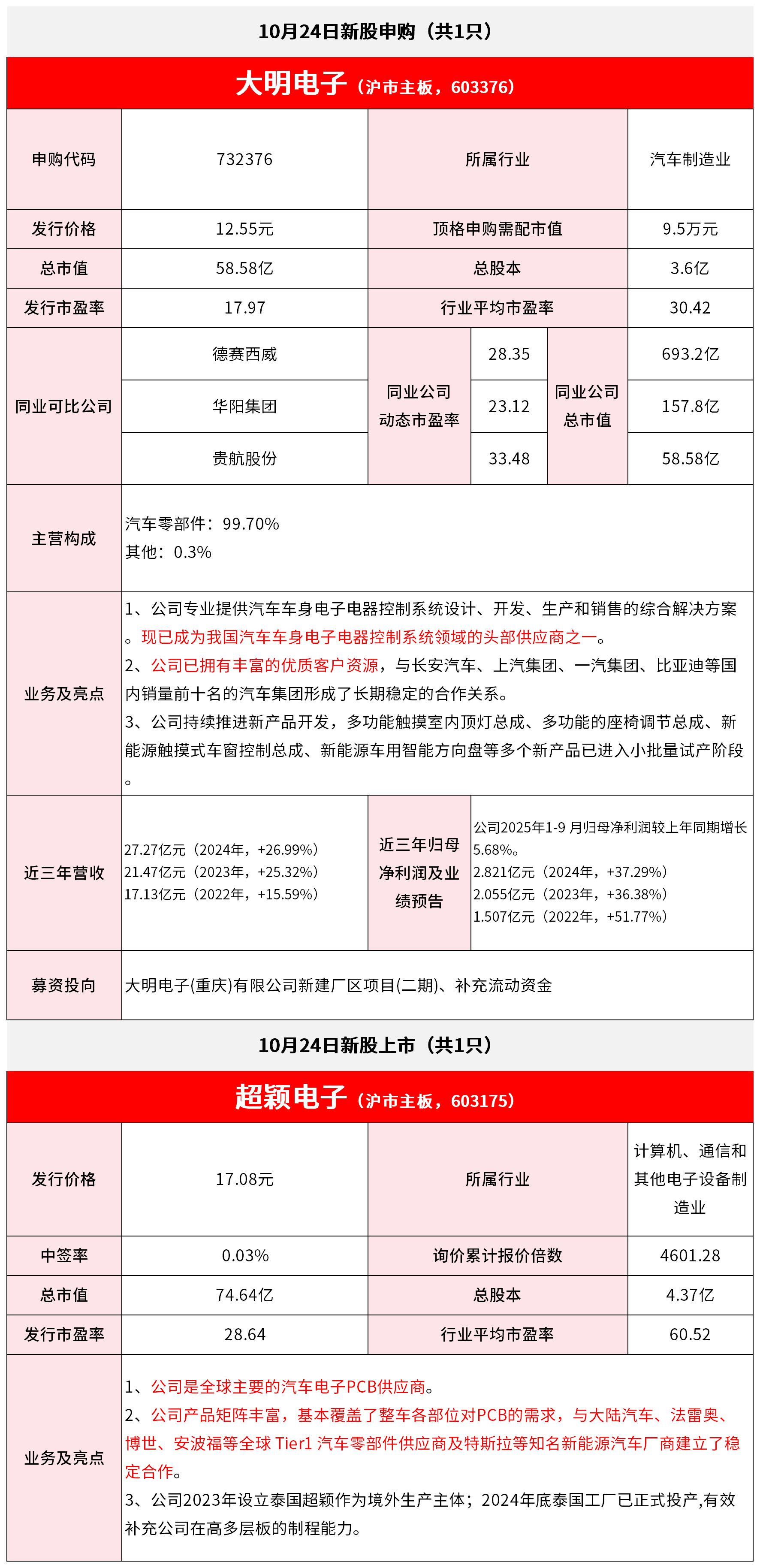 | 超颖电子(沪市主板,60 | | --- | 10月24日新股申购 (共1) 大明电子(沪市主板,60 | 申购代码 | 732376 | | --- | --- | | 发行价格 | 12.55元 顶格 | | 总市值 | 58.58亿 | | 发行市盈率 | 17.97 行业 | | 同业可比公司 | 德赛西威 间业公司 动态市盈率 | | | 华阳集团 | | | 贵航股份 | | 主营构成 | 汽车零部件:99.70% | | | 其他:0.3% | | | 1、公司专业提供汽车车身电子电器控制系统设计 | | | 。现已成为我国汽车车身电子电器控制系统领域[ | | | 2、公司已拥有丰富的优质客户资源,与长安汽车 | | 业务及亮点 | 内销量前十名的汽车集团形成了长期稳定的合作; | | | --- | --- | --- | | | 3、公司持续推进新产品开发,多功能触摸室内顶 能源触摸式车窗控制总成、新能源车用智能方向3 | | | O | | | | 近三年营收 | | 近三年归母 | | | 27.27亿元(2024年,+26.99%) | | | | 21.47亿元(2023年,+ ...