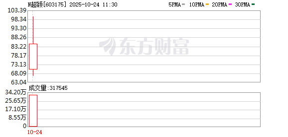 N超颖今日上市,开盘价70.10元,上涨310.42%。 公司主营业务为印制电路板的研发、生产和销售。 证券时报·数据宝统计显示,公司本次发行总量为5250.00万股,其中,网上发行量为3079.00万股,发行 价格为17.08元/股,发行市盈率28.64倍,行业平均市盈率60.52倍,网上发行有效申购户数为1331.06万 户,网上发行最终中签率为0.028609%。公司首发募集资金8.97亿元,募集资金主要投向超颖电子电路 股份有限公司补充流动资金及偿还银行贷款、超颖电子电路股份有限公司高多层及HDI项目第二阶段 等。(数据宝) 近期上市新股首日表现 | 代码 | 简称 | 上市日期 | 发行价(元) | 发行市盈率(倍) | 首日开盘涨跌幅(%) | 所属行业 | | --- | --- | --- | --- | --- | --- | --- | | 603175 | N超颖 | 2025.10.24 | 17.08 | 28.64 | 310.42 | 电子 | | 001386 | C马可波 | 2025.10.22 | 13.75 | 14.27 | 140.73 | 轻工制造 | | 601 ...