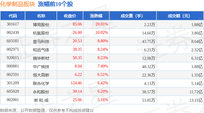 Market Overview - On October 9, the chemical products sector rose by 1.62%, with Boyuan Co., Ltd. leading the gains [1] - The Shanghai Composite Index closed at 3933.97, up 1.32%, while the Shenzhen Component Index closed at 13725.56, up 1.47% [1] Top Performers - Boyuan Co., Ltd. (301617) closed at 85.06, with a significant increase of 20.01% and a trading volume of 22,300 lots, amounting to 188 million yuan [1] - Hangzhou Oxygen Plant Group Co., Ltd. (002430) saw a rise of 10.02%, closing at 26.80 with a trading volume of 146,000 lots [1] - Huangma Technology (603181) increased by 8.80%, closing at 20.53 with a trading volume of 437,500 lots [1] Underperformers - Yayun Co., Ltd. (603790) experienced a decline of 9.99%, closing at 23.33 with a trading volume of 61,800 lots [2] - Kaimete Gas (002549) fell by 7.23%, closing at 22.58 with a trading volume of 1,372,200 lots [2] - Tongda Co., Ltd. (300321) decreased by 6.15%, closing at 38.58 with a trading volume of 43,200 lots [2] Capital Flow - The chemical products sector saw a net outflow of 380 million yuan from institutional investors, while retail investors had a net inflow of 401 million yuan [2] - The table of capital flow indicates that major stocks like Hangzhou Oxygen Plant and Boyuan Co. experienced varying levels of net inflow and outflow from different investor types [3]