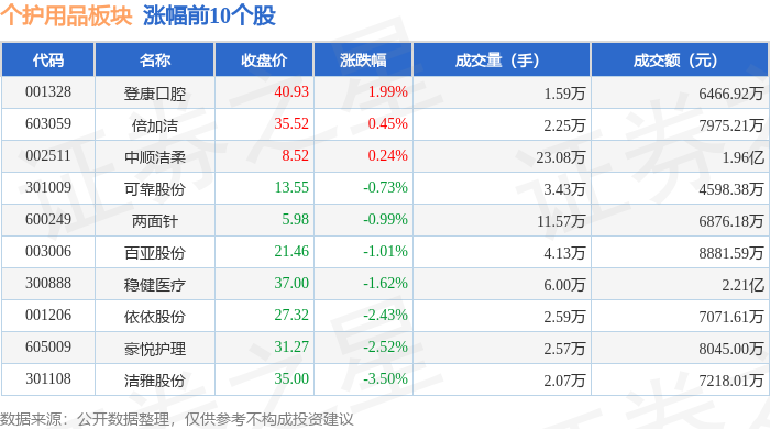 | 代码 | 名称 | 收盘价 | 涨跌幅 | 成交量(手) | 成交额(元) | | --- | --- | --- | --- | --- | --- | | 603193 | 润本股份 | 25.71 | 1.78% | 4.13万 | 1.06亿 | | 300888 | 稳健医疗 | 36.94 | 1.40% | 5.08万 | + 1.87亿 | | 001206 | 依依股份 | 28.47 | 1.10% | 2.18万 | 6178.24万 | | 605009 | 家用护理 | 32.39 | 0.90% | 1.62万 | 5232.99万 | | 002511 | 中顺洁桑 | 8.43 | 0.00% | 15.91万 | 1.34亿 | | 600249 | 两面针 | 6.10 | 0.00% | 9.92万 | 6038.24万 | | 301009 | 可靠股份 | 13.78 | -0.07% | 4.33万 | 5959.20万 | | 003006 | 百亚股份 | 22.28 | -0.13% | 5.36万 | 1.19亿 | | 001328 | 登康口腔 | ...