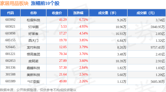 证券之星消息,1月28日家居用品板块较上一交易日下跌0.51%,梦天家居领跌。当日上证指数报收于 4151.24,上涨0.27%。深证成指报收于14342.9,上涨0.09%。家居用品板块个股涨跌见下表: | 代码 | 名称 | 收盘价 | 涨跌幅 | 成交量(手) | 成交额(元) | | | --- | --- | --- | --- | --- | --- | --- | | 301588 | 美新科技 | 22.82 | 5.45% | 8.21万 | | 1.84亿 | | 002572 | 索菲亚 | 14.60 | 3.77% | 21.93万 | | 3.16亿 | | 300749 | 顶固集创 | 15.87 | 2.92% | 12.08万 | | 1.87亿 | | 001216 | 华瓷股份 | 18.10 | 2.84% | 11.58万 | | 2.06亿 | | 603992 | 松蒙科技 | 42.44 | 2.79% | 4.40万 | | 1.85 Z | | 001322 | 箭牌家居 | 66"8 | 2.16% | 15.47万 | | 1.40亿 | | 6038 ...