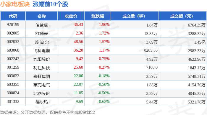 | 代码 | 名称 | 收盘价 | 涨跌幅 | 成交量(手) | 成交额(元) | | | --- | --- | --- | --- | --- | --- | --- | | 6610Z6 | 倍益康 | 35.75 | 0.59% | 1.17万 | 1 | 4096.76万 | | 920926 | 鸡智科技 | 19.58 | 0.31% | 1.91万 | | 3666.07万 | | 002032 | 苏泊尔 | 47.81 | 0.17% | 2.40万 | | 1.14亿 | | 301187 | 欧圣电气 | 26.50 | -0.30% | - 3.16万 | | 8243.67万 | | 001259 | 利仁科技 | 25.53 | -0.66% | 1.14万 | | 2889.72万 | | 003023 | 彩虹集团 | 22.10 | -0.94% | 3.49万 | | 7622.20万 | | 300824 | 北鼎股份 | 11.91 | -1.00% | 3.80万 | | 4478.55万 | | 603868 | てお申請 | 35.78 | -1.05% | 9 ...