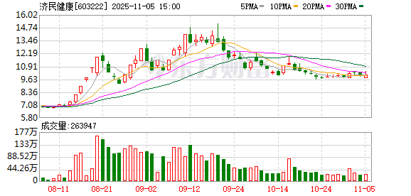 Core Points - Jimin Health's stock price increased by 2.08% on November 11, reaching 10.33 CNY per share, with a market capitalization of 5.424 billion CNY [1] - The company has seen a year-to-date stock price increase of 52.14%, with a recent 5-day increase of 3.20% and a 60-day increase of 45.90% [1] - Jimin Health has appeared on the trading leaderboard 13 times this year, with the latest occurrence on September 11, where it recorded a net purchase of 66.0795 million CNY [1][2] Financial Performance - For the period from January to September 2025, Jimin Health reported a revenue of 545 million CNY, a year-on-year decrease of 20.21%, and a net profit of -77.1504 million CNY, a decrease of 371.51% [2] - The company has distributed a total of 127 million CNY in dividends since its A-share listing, with 10.7447 million CNY distributed in the last three years [3] Shareholder Information - As of September 30, Jimin Health had 58,100 shareholders, an increase of 107% from the previous period, with an average of 9,035 circulating shares per shareholder, a decrease of 51.69% [2] Business Overview - Jimin Health, established on December 24, 1996, and listed on February 17, 2015, is primarily engaged in the research, production, and sales of medical devices, medical services, and large-volume intravenous products [1] - The company's revenue composition includes 52.07% from pharmaceutical manufacturing, 46.01% from medical services, 1.54% from pharmaceutical trading, and 0.38% from other sources [1] Industry Classification - Jimin Health is classified under the pharmaceutical and biological industry, specifically in medical devices and consumables, with involvement in innovative drugs, cell therapy, in vitro diagnostics, antigen testing, and medical devices [2]