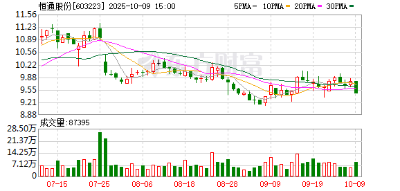 9月30日,恒通股份大宗交易成交114万股,成交额990.66万元,占当日总成交额的15.76%,成交价8.69 元,较市场收盘价9.77元折价11.05%。 | 交易日期 | 证券简称 | 证券代码 | | | 成交价(元) 成交金额(万元) 成交量(*) 买入营业部 | | 卖出营业部 | 是否为专场 | | | --- | --- | --- | --- | --- | --- | --- | --- | --- | --- | | 2025-09-30 | 但通股份 | 603223 | 8.69 | 399.74 | 46 | 公司有名器控有限 | 2016 11:23 | | Ka | | 2025-09-30 | 但通股份 | 603223 | 8.69 | 295.46 | 34 | 参景中营米铁路透 | 品番号為電話 | | KI | | 2025-09-30 | 但通常的份 | 603223 | 8.69 | 295.46 | 34 | 福昌美容認定對薩 | 器量是含量感染器 | | Ka | ...