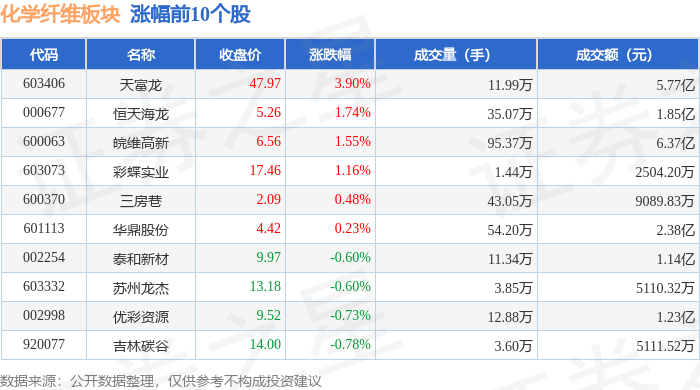 证券之星消息,10月14日化学纤维板块较上一交易日下跌2.93%,新凤鸣领跌。当日上证指数报收于 3865.23,下跌0.62%。深证成指报收于12895.11,下跌2.54%。化学纤维板块个股涨跌见下表: 从资金流向上来看,当日化学纤维板块主力资金净流出1.79亿元,游资资金净流入1637.12万元,散户资 金净流入1.63亿元。化学纤维板块个股资金流向见下表: | 代码 | 名称 | 主力净流入(元) | 主力净占比 游资净流入 (元) | | 游资净占比 散户净流入 (元) | | 散户净占比 | | --- | --- | --- | --- | --- | --- | --- | --- | | 600063 院维高新 | | -2524.34万 | 3.96% | -401.05万 | -0.63% | -2123.30万 | -3.33% | | 603406 | 天富龙 | 1987.55万 | 3.45% | -782.89万 | -1.36% | -1204.66万 | -2.09% | | 000677 恒天海龙 | | 1437.13万 | 7.76% | -1994.94万 | -1 ...