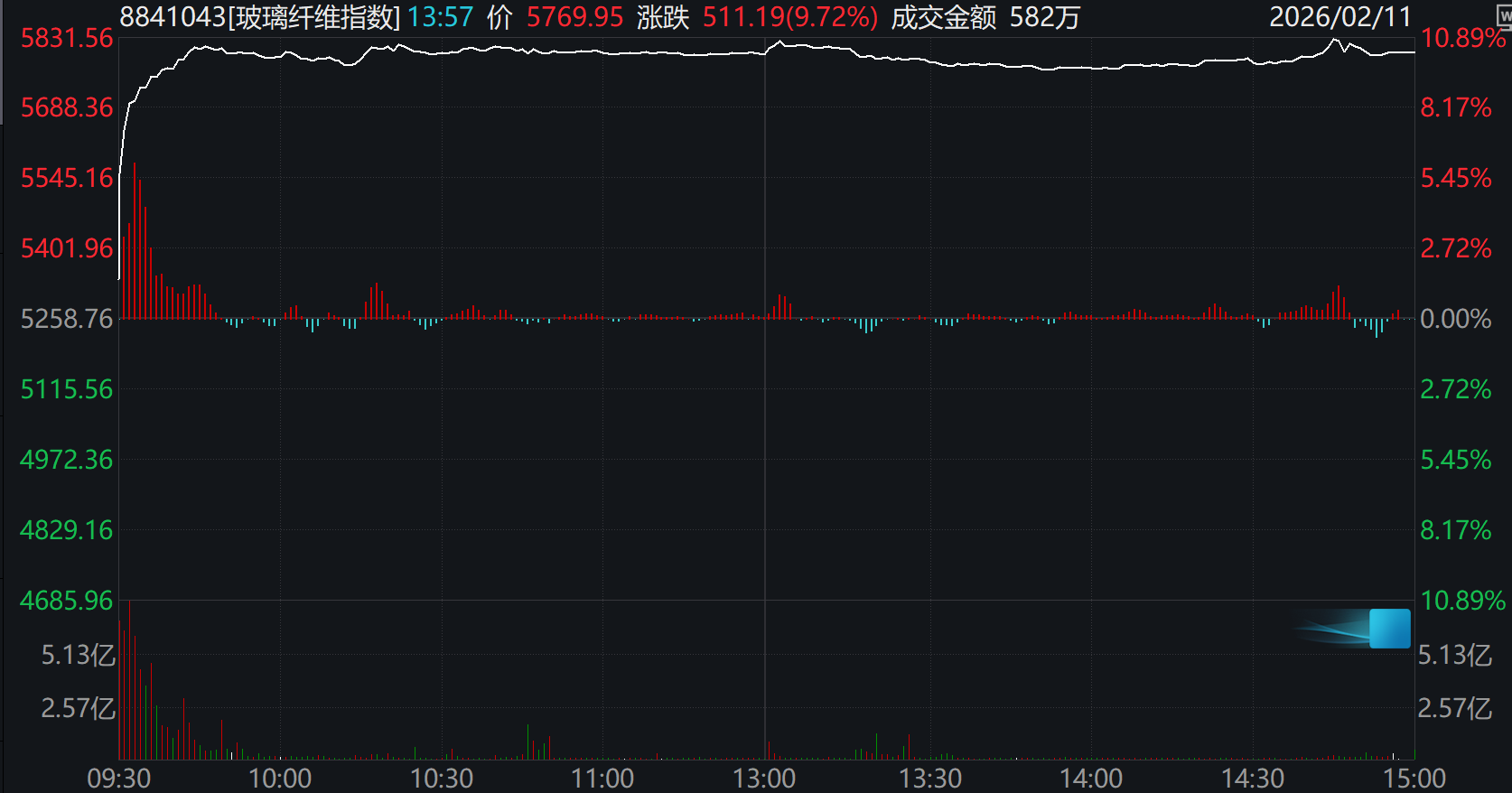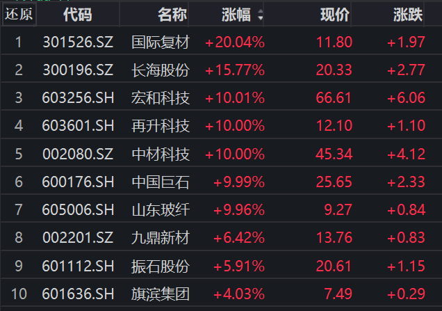 2月11日,A股三大指数涨跌不一,创业板指跌超1%。沪深两市成交额2万亿,较上一个交易日缩量1237亿,全市场超3200只个股下跌。 从板块来看,化工板块近期反复走强,吉华集团(603980)5天4板,泰和新材(002254)、百川股份(002455)、醋化股份(603968)、华尔泰 (001217)涨停。 消息面上,据期货日报,近日,瑞银最新发布研究报告(下称报告)引发化工行业广泛关注。报告明确上调中国化工行业预期,认为在多重积极因素共振 的情况下,中国化工行业将在2026—2028年开启新一轮上行周期,行业盈利修复与估值回升值得期待。 玻纤制造行业板块集体大涨,个股几乎全部涨停,这种行情极为罕见。国际复材(301526)开盘后6分钟之后封死20%涨停板,长海股份(300196)涨超 15%,宏和科技(603256)、再升科技(603601)、中材科技(002080)、中国巨石(600176)、山东玻纤(605006)集体封板。 | < 日 | | 玻璃纤维指数(8841043) | | | | --- | --- | --- | --- | --- | | | | 5800.81 542.05 +10. ...