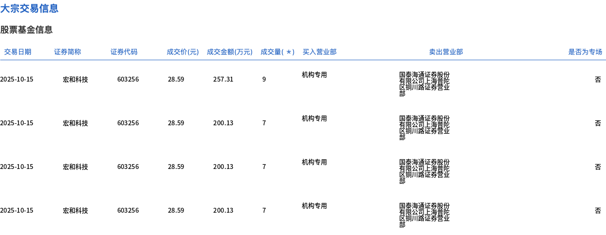宏和科技10月15日现4笔大宗交易 总成交金额857.7万元 其中机构买入857.7万元 溢价率为-13.68%
