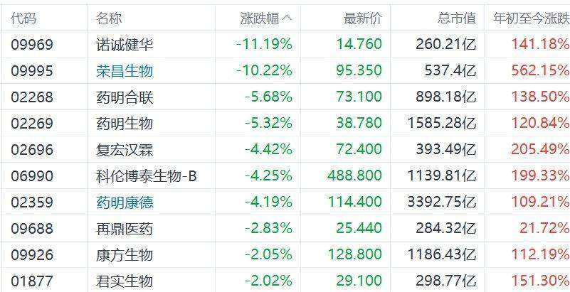 【免责声明】本文仅代表作者本人观点,与和讯网无关。和讯网站对文中陈述、观点判断保持中立,不对所包含 内容的准确性、可靠性或完整性提供任何明示或暗示的保证。请读者仅作参考,并请自行承担全部责任。邮箱: news_center@staff.hexun.com 格隆汇10月10日|延续昨日跌势,港股股今日继续回调。其中,诺诚健华跌超11%,荣昌生物跌超10%,药明合 联、药明生物跌超5%,复宏汉霖、科伦博泰生物、跌超4%。 | 代码 | 名称 | 涨跌幅 ^ | 最新价 | 总市值 | 年初至今涨跌 | | --- | --- | --- | --- | --- | --- | | 09969 | 诺诚健华 | -11.19% | 14.760 | 260.21亿 | 141.18% | | 09995 | 荣昌生物 | -10.22% | 95.350 | 537.4亿 | 562.15% | | 02268 | 药明合联 | -5.68% | 73.100 | 898.18 Z | 138.50% | | 02269 | 药明生物 | -5.32% | 38.780 | 1585.28亿 | 120.84% | ...