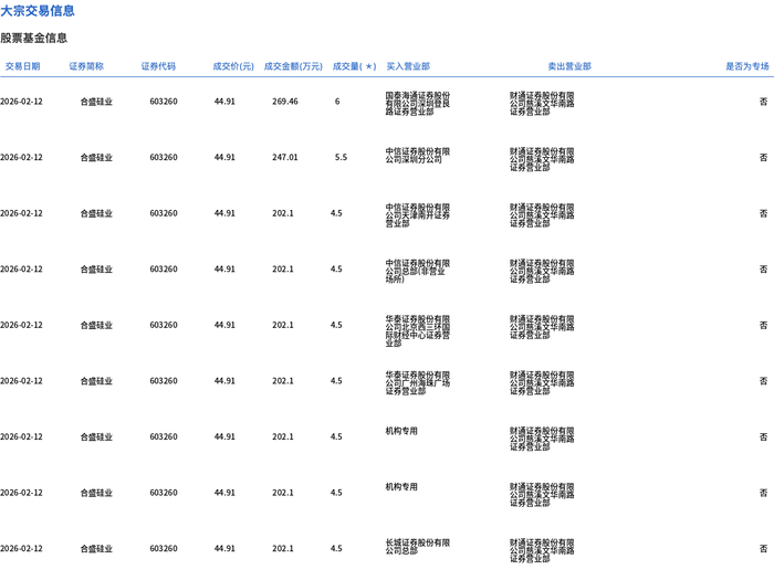 2月12日,合盛硅业大宗交易成交145.4万股,成交额6529.96万元,占当日总成交额的19.76%,成交价 44.91元,较市场收盘价48.82元折价8.01%。 大宗交易信息 股票基金信息 | 交易日期 | 证券商标 | 证券代码 | | | 成交价(元) 成交金额(万元) 成交量(*) 买入营业部 | | 类出管业部 | 是否为专场 | | --- | --- | --- | --- | --- | --- | --- | --- | --- | | 2026-02-12 | 合體硅非 | 603260 | 44.91 | 1122.75 | 25 | 机构专用 | 空港 | 잡 | | 2026-02-12 | 含盛硅业 | 603260 | 44.91 | 988.02 | 22 | | 好 : 1992 : 2 | 图 | | 2026-02-12 | 合體硅补 | 603260 | 44.91 | 538.92 | 12 | | | 랜 | | 2026-02-12 | 合體硅亚 | 603260 | 44.91 | 449.1 | 10 | 品牌 - | | 잡 | | 2026-02-12 ...