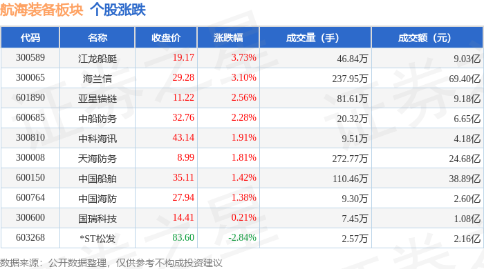 证券之星消息,2月4日航海装备板块较上一交易日上涨1.5%,江龙船艇领涨。当日上证指数报收于 4102.2,上涨0.85%。深证成指报收于14156.27,上涨0.21%。航海装备板块个股涨跌见下表: | 代码 | 名称 | 主力净流入(元) | | 主力净占比 游资净流入 (元) | | 游资净占比 散户净流入 (元) | | 散户净占比 | | --- | --- | --- | --- | --- | --- | --- | --- | --- | | 600150 | 中国船舶 | | 1.02 Z | 2.63% | -254.59万 | -0.07% | -9964.76万 | -2.56% | | 300589 | 江龙船艇 | | 8204.92万 | 9.09% | -1994.64万 | -2.21% | -6210.28万 | -6.88% | | 600764 | 中国海防 | | 384.31万 | 1.48% | -450.16万 | -1.73% | 65.86万 | 0.25% | | 300600 | 国瑞科技 | | -235.86万 | -2.19% | -83.29万 ...