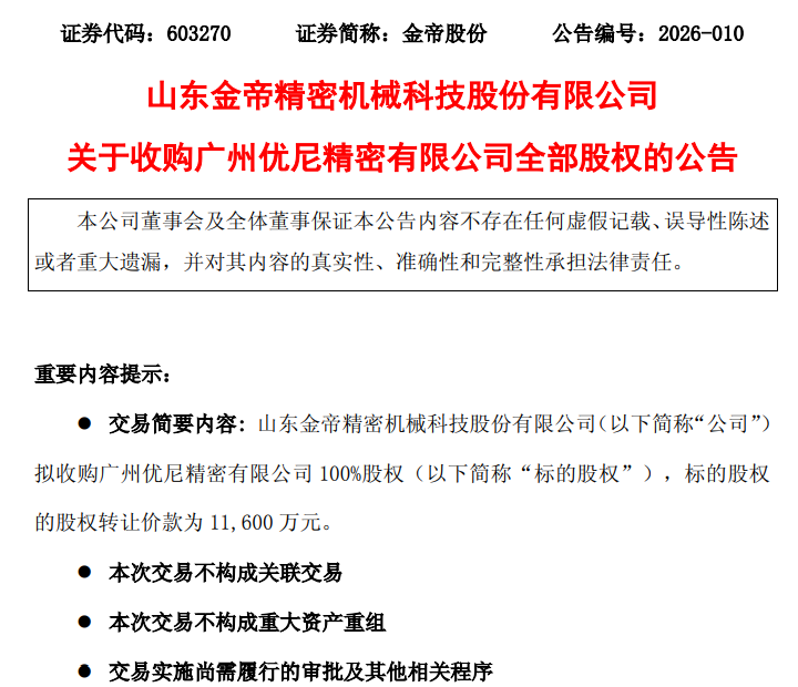 2月6日晚间,金帝股份(603270)发布公告,公司拟收购广州优尼精密有限公司(以下简称"优尼精密")100%股权,股权转让价款为1.16亿元。此次收购可 以看做金帝股份在汽车精密制造领域打出的"加码+拓展"的组合拳。 公告称,本次交易不构成关联交易,不构成重大资产重组。相关程序方面,公司于2026年2月6日召开第四届董事会第三次会议,审议通过了《关于收购广 州优尼精密有限公司全部股权的议案》。本次交易已达到股东会审议标准,尚需提交股东会审议。 公开资料显示,金帝股份主营业务是精密机械零部件的研发、生产和销售,公司的主要产品是轴承保持架及配件、精密零部件。 公告显示,广州优尼精密有限公司成立于2009年11月,主要经营业务范围包括设计、开发、制造自动变速箱及其精密零配件,制造汽车用精锻毛坯件、精 密冲压半成品等。 财务数据显示,优尼精密近年来经营面临一定压力,近两年持续亏损。根据上会会计师事务所(特殊普通合伙)审计的财务数据,2024年度,优尼精密实现 营业收入4.05亿元,净利润为-8317.43万元,扣除非经常性损益后的净利润为-8328.93万元;2025年1月~8月,公司实现营业收入2.11亿元,净利 ...