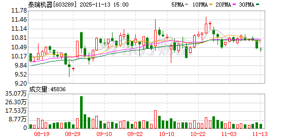 11月14日,泰瑞机器大宗交易成交90万股,成交额946.8万元,占当日总成交额的5.58%,成交价10.52 元,较市场收盘价10.68元折价1.5%。 | 交易日期 | 证券简称 | 证券代码 | 成交价(元) 成交金额(万元) 成交量( *) 买入营业部 | | | 卖出营业部 是否为专场 | | --- | --- | --- | --- | --- | --- | --- | | 2025-11-14 | 泰瑞机器 | 603289 | 10.52 946.8 | 90 | 机构专用 | 有限公司法经劈发 KO | ...