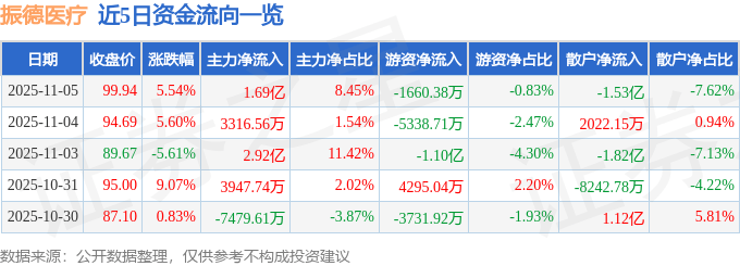 振德医疗(603301)11月5日主力资金净买入1.69亿元