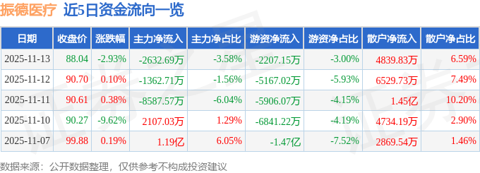 振德医疗(603301)11月13日主力资金净卖出2632.69万元