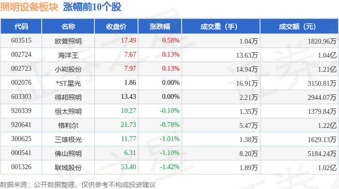 从资金流向上来看,当日照明设备板块主力资金净流出995.05万元,游资资金净流出2277.39万元,散户 资金净流入3272.43万元。照明设备板块个股资金流向见下表: 证券之星消息,10月23日照明设备板块较上一交易日上涨1.46%,立达信领涨。当日上证指数报收于 3922.41,上涨0.22%。深证成指报收于13025.45,上涨0.22%。照明设备板块个股涨跌见下表: | 代码 | 名称 | 收盘价 | 涨跌幅 | 成交量(手) | 成交额(元) | | --- | --- | --- | --- | --- | --- | | 605365 | 立达信 | 16.65 | 3.93% | 12.31万 | 2.02亿 | | 002638 | 勤上股份 | 2.82 | 2.17% | 34.31万 | 9500.37万 | | 300625 | 三雄极光 | 12.35 | 2.15% | 3.28万 | 4014.14万 | | 603515 | 欧普照明 | 18.06 | 2.03% | 2.13万 | 3803.51万 | | 002076 | *ST星光 | 2.02 | 2.02% | ...
