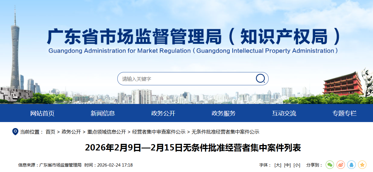 转自:广东省市场监督管理局网站 | 序 号 | 案件名称 | 参与集中的经营者 | 审结时间 | | --- | --- | --- | --- | | 1 | 易方达私募基金管理有限公司与珠海润合智汇医药投资有限公司新设合 | 易方达私募基金管理有限公司、珠海润合智汇医药投资有限公司 | 2026年2月 | | | 营企业案 | | 9日 | | 2 | 广州医药股份有限公司收购浙江省医药工业有限公司股权案 | 广州医药股份有限公司、浙江省医药工业有限公司 | 2026年2月 11日 | | | 国投交通控股有限公司与海南省洋浦开发建设控股有限公司收购国投裕 | 国投交通控股有限公司、海南省洋浦开发建设控股有限公司、国 | 2026年2月 | | 3 | 廊洋浦港口有限公司股权案 | 投裕廊洋浦港口有限公司 | 11日 | | 4 | 广州工业投资控股集团有限公司收购宁波旭升集团股份有限公司股权案 | 广州工业投资控股集团有限公司、宁波旭升集团股份有限公司 | 2026年2月 13日 | ...