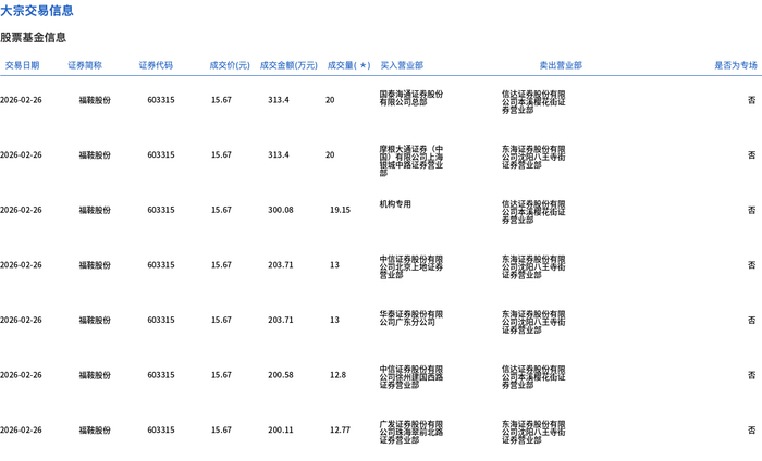 2月26日,福鞍股份大宗交易成交110.72万股,成交额1734.99万元,占当日总成交额的3.58%,成交价 15.67元,较市场收盘价17.95元折价12.7%。 | 交易日期 | 证券調称 | 证券代码 | | | 成交价(元) 成交金额(万元) 成交量(*) 买入营业部 | | 类出营业部 | 是否为专场 | | --- | --- | --- | --- | --- | --- | --- | --- | --- | | 2026-02-26 | 福枝胶份 | 603315 | 15.67 | 313.4 | 20 | HONE BE REAL | National Production | KA | | 2026-02-26 | 福鞋股份 | 603315 | 15.67 | 313.4 | 20 | 国)有限公司上海 | 图层的人系统设 | 1631 | | 2026-02-26 | 福硅般份 | 603315 | 15.67 | 300.08 | 19.15 | 机构专用 | 空间主要最振谐播 | 香 | | 2026-02-26 | 福枝胶份 | 603315 | 15.67 | 203.7 ...