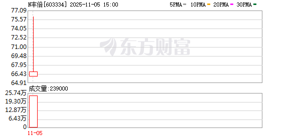 N丰倍今日上市,开盘价66.00元,上涨169.50%。 | 代码 | 简称 | 上市日期 | 发行价 | 发行市盈率 | 首日开盘涨跌幅 | 所属行业 | | --- | --- | --- | --- | --- | --- | --- | | | | | (元) | (倍) | (%) | | | 603334 | N丰倍 | 2025.11.05 | 24.49 | 30.47 | 169.50 | 基础化工 | | 920009 | 丹娜生物 | 2025.11.03 | 17.10 | 11.75 | 447.95 | 医药生物 | | 688783 | 西安奕材 U | 2025.10.28 | 8.62 | | 361.48 | 电子 | | 688765 | 禾元生物 U | 2025.10.28 | 29.06 | | 202.82 | 医药生物 | | 688759 | 必贝特-U | 2025.10.28 | 17.78 | | 175.03 | 医药生物 | | 920020 | 泰凯英 | 2025.10.28 | 7.50 | 11.02 | 154.00 | 汽车 | | 60 ...