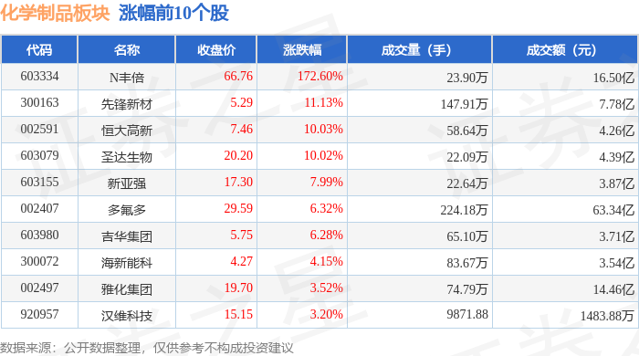 | 代码 | 名称 | 收盘价 | 涨跌幅 | 成交量(手) | 成交额(元) | | --- | --- | --- | --- | --- | --- | | 603823 | 百合花 | 17.45 | -10.01% | 58.34万 | 10.40亿 | | 603192 | 汇得科技 | 26.23 | -6.25% | 17.22万 | 4.50亿 | | 300848 | 美瑞新材 | 18.50 | -3.90% | 41.53万 | 7.57亿 | | 002246 | 北化股份 | 19.25 | -3.46% | 1 15.18万 | 2.95亿 | | 001335 | 信訓科技 | 38.97 | -2.33% | 3.89万 | 1.51亿 | | 002549 | 凯美特气 | 22.81 | -2.27% | 55.76万 | 12.67亿 | | 600165 | *ST宁科 | 3.93 | -2.00% | 17.27万 | 6915.55万 | | 301617 | 博苑股份 | 85.84 | -1.99% | 2.70万 | 2.34亿 | | 600352 | ...