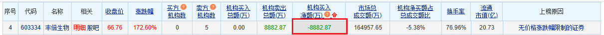 丰倍生物龙虎榜:机构包揽卖出前5 净卖出共8883万元