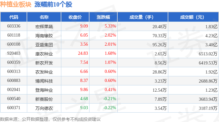 证券之星消息,1月21日种植业板块较上一交易日上涨0.05%,宏辉果蔬领涨。当日上证指数报收于 4116.94,上涨0.08%。深证成指报收于14255.12,上涨0.7%。种植业板块个股涨跌见下表: | 代码 | 名称 | 收盘价 | 涨跌幅 | 成交量(手) | 成交额(元) | | --- | --- | --- | --- | --- | --- | | 603336 | 宏辉果蔬 | 9.09 | 5.33% | 20.48万 | 1.83亿 | | 601118 | 海南橡胶 | 6.05 | 2.02% | 70.33万 | 4.23亿 | | 600108 | 亚盛集团 | 3.56 | 2.01% | 95.26万 | 3.40亿 | | 920403 | 康农种业 | 24.83 | 1.68% | - 2.65万 | 6513.02万 | | 600359 | 新农开发 | 7.54 | 1.07% | 8.56万 | 6419.53万 | | 600313 | 农发种业 | 6.66 | 0.60% | 28.86万 | 1.92亿 | | 600883 | 博園科技 | 8.37 | ...