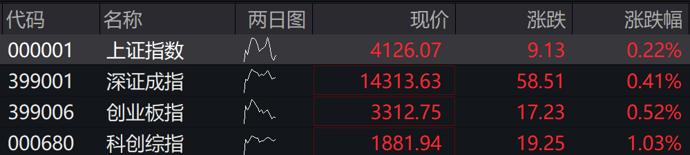 盘面上,半导体、AI算力产业链再度走强,存储器、汽车芯片方向领涨。 09:25 A股开盘丨三大指数集体高开 沪指涨0.22%,深成指涨0.41%,创业板指涨0.52%。科创综指涨1.03%。 | 代码 | 名称 | 两日图 | 现价 | 涨跌 | 涨跌幅 | | --- | --- | --- | --- | --- | --- | | 000001 | 上证指数 | M | 4126.07 | 9.13 | 0.22% | | 399001 | 深证成指 | W | 14313.63 | 58.51 | 0.41% | | 399006 | 创业板指 | N W | 3312.75 | 17.23 | 0.52% | | 000680 | 科创综指 | NV | 1881.94 | 19.25 | 1.03% | 盘面上,半导体、AI算力产业链再度走强,存储器、汽车芯片方向领涨;AI手机、稳定币、免税店、网络安全题材活跃。贵金属板块大幅回 调。 09:22 港股开盘丨恒生指数高开0.62% 09:15 人民币对美元中间价报7.0019,调贬5个基点。前一交易日中间价报7.0014。 恒生指数高开0.62%, ...