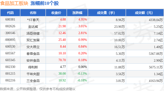 | 代码 | 名称 | 收盘价 | 涨跌幅 | 成交量(手) | 成交额(元) | | --- | --- | --- | --- | --- | --- | | 001215 | 千味央厨 | 38.05 | -0.91% | 4.29万 | 1.65亿 | | 605089 | 味知香 | 26.11 | -0.84% | 1.48万 | 3853.23万 | | 600381 | *ST春天 | 4.65 | 0.00% | 2.91万 | 1345.66万 | | 603262 | 技源集团 | 30.17 | 0.00% | 1.19万 | 3574.43万 | | 920826 | 盖世食品 | 13.36 | 0.07% | 8.09万 | 1.08亿 | | 002840 | 华统院投 | 10.77 | 0.09% | 5.36万 | 5755.40万 | | 603536 | 惠发食品 | 10.68 | 0.09% | 14.98万 | 1.61亿 | | 600073 | 光明肉业 | 7.10 | 0.14% | 18.29万 | 1.30亿 | | 920429 | 康比特 | 4 ...