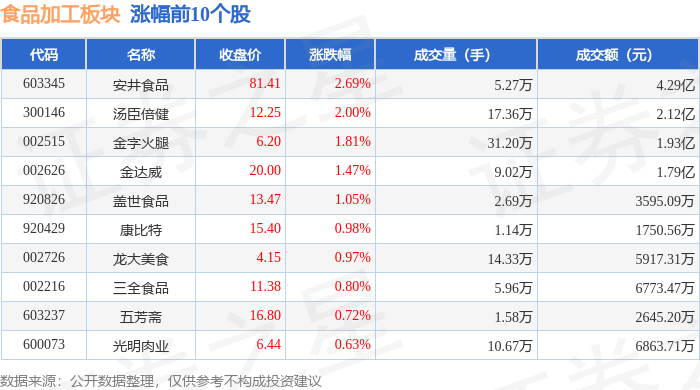 | 代码 | 名称 | 收盘价 | 涨跌幅 | 成交量(手) | 成交额(元) | | --- | --- | --- | --- | --- | --- | | 600381 | *ST春天 | 4.33 | -2.26% | 4.33万 | 1871.68万 | | 300791 | 仙乐健康 | 25.48 | -1.47% | 4.61万 | 1.17亿 | | 605567 | 春雪食品 | 10.92 | -0.73% | 4.28万 | 4732.24万 | | 605338 | 巴比食品 | 31.10 | -0.70% | 7.02万 | 2.21亿 | | 002702 | 海欣食品 | 7.07 | -0.70% | 47.32万 | 3.35 Z | | 000639 | 西王食品 | 3.29 | -0.60% | 52.95万 | 1.74亿 | | 001215 | 千味央厨 | 38.28 | -0.57% | 2.96万 | 1.15亿 | | 000529 | 广弘控股 | 6.00 | -0.17% | 7.54万 | 4525.02万 | | 603536 | 惠发食品 ...