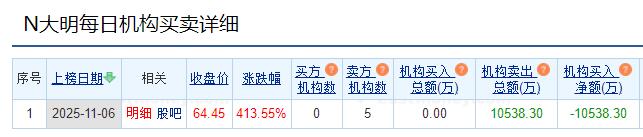 | 序号 上榜日期� | 相关 | 收盘价 涨跌幅 | 买方 卖方 机构买入 > | | 机构卖出 0 | 机构买入 | | --- | --- | --- | --- | --- | --- | --- | | | | | 机构数 机构数 | 总额(万) | 总额(万) | 净额(万) | | 2025-11-06 明细 股吧 64.45 413.55% | | | 5 | 0.00 | 10538.30 | -10538.30 | 中国经济网北京11月6日讯大明电子(603376.SH)今日在上交所主板上市,截至收盘报64.45元,涨幅413.55%,总市值257.80亿元。 龙虎榜数据显示,卖出大明电子金额最大的前五名中,有5家机构专用席位。经统计,机构席位今日卖出大明电子净额为10538.30万元。 | 买入金额最大的前5名 | | | | | | | | --- | --- | --- | --- | --- | --- | --- | | 序号 | 交易营业部名称 | | | 买入金额(万) | 占总成交比例 | 卖出金额(万) | | 1 | 东方财富证券股份有限公司拉萨金融城南环路证券营业部 ...