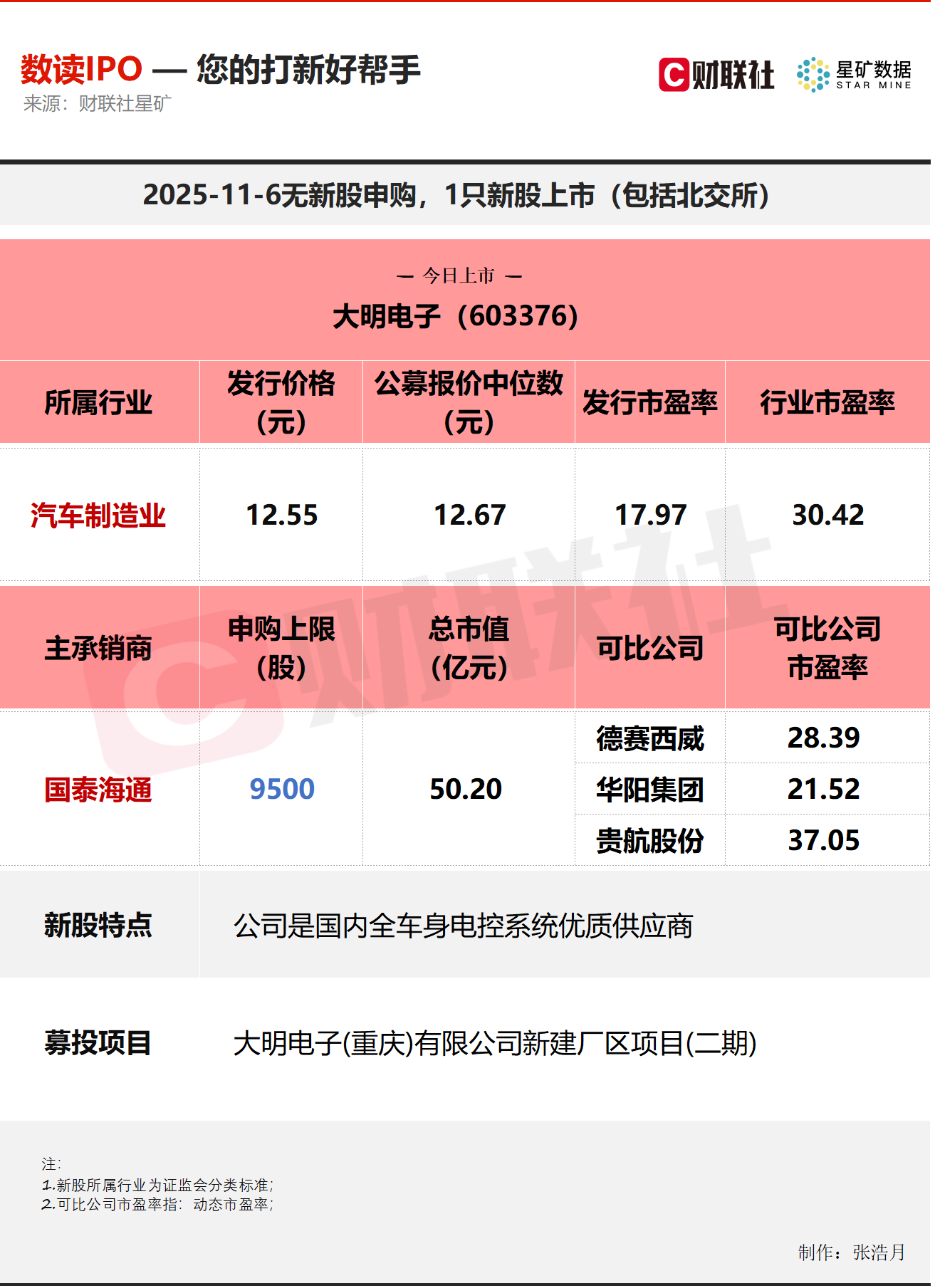 公司2022-2024年分别实现营业收入17.13亿元/21.47亿元/27.27亿;实现归母净利润1.51亿元/2.05亿元/2.82亿元。根据公司管理层初步预测,公司2025年前三 季度营业收入较上年同期增长19.73%,归母净利润较上年同期增长5.68%。 智通财经11月6日讯,今日无新股申购;有1只新股上市,为沪市主板的大明电子。 今日上市新股 大明电子是国内全车身电控系统优质供应商,公司产品覆盖驾驶辅助、门窗控制、智能光电、座舱中控及座椅调节等。客户包括比亚迪、蔚来、小鹏、理 想、零跑等多家知名车企。 | | ー 今日上市 一 | | | | | --- | --- | --- | --- | --- | | | 大明电子 (603376) | | | | | 所属行业 | 发行价格 公募报价中位数 | | 发行市盈率 | 行 | | | (元) | (元) | | | | 汽车制造业 | 12.55 | 12.67 | 17.97 | | | 主承销商 | 申购上限 | 总市值 | 可比公司 | | | | (股) | (亿元) | | | | 国泰海道 | 9500 | 50.20 | 德赛西威 ...