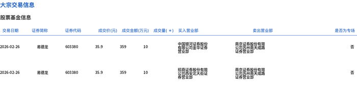 | 交易日期 | 证券調称 | 证券代码 | | | 成交价(元) 成交金额(万元) 成交量( *) 买入营业部 | | 类出营业部 | 是否为专场 | | | --- | --- | --- | --- | --- | --- | --- | --- | --- | --- | | 2026-02-26 | 易德龙 | 603380 | 35.9 | ਤੋਂ ਤੇ ਰੋ | 10 | 景而需 申博营贸易志愿意感 | 是最大的是 | | M | | 2026-02-26 | 易德龙 | 603380 | 35.9 | ਤਵਰੇ | 10 | 器量量型能类型菌 | 品 有用品 不管路 | | Ka | 2月26日,易德龙大宗交易成交20万股,成交额718万元,占当日总成交额的7.04%,成交价35.9元,较 市场收盘价40.02元折价10.29%。 ...